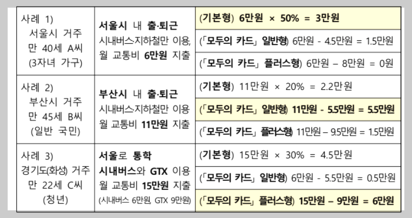 모두의카드는 이런 부분을 보완해 환급 기준금액이라는 개념을 도입했습니다. 지역과 이용자 유형에 따라 기준금액이 다르게 설정되고, 그 선을 넘는 지출은 다시 돌려받는 방식입니다. 또한 이용자가 미리 일반형이나 플러스형을 선택할 필요 없이, 한 달 이용 내역을 기준으로 가장 유리한 방식이 자동 적용된다는 점도 큰 변화입니다.
