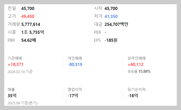 52주 최저 6,300원에서 고점 49,450원까지의 상승 폭은 단순 반등이라 보기 어려울 정도로 큽니다.